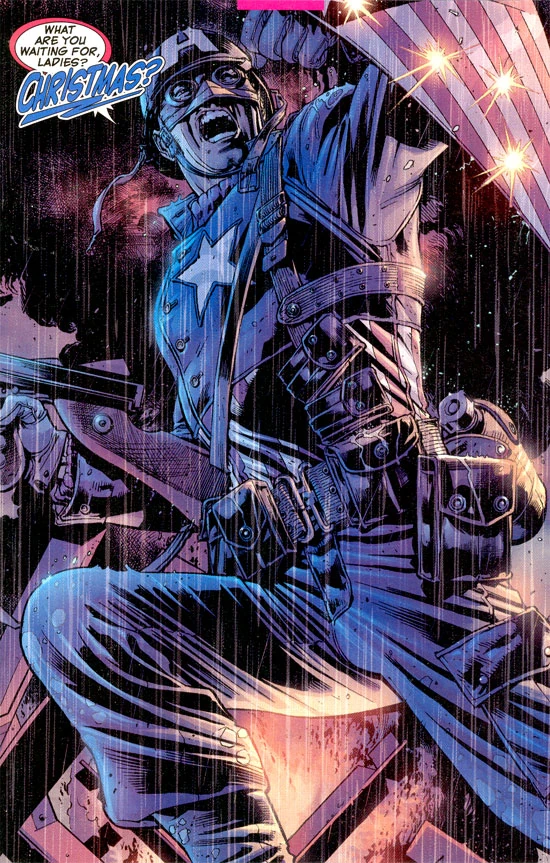 Este ahínco provocó el interés gubernamental, quien le convenció para participar en el Proyecto Renacimiento. Antes de someterse a los experimentos, comenzaría a salir con Gail, una compañera del instituto. Convirtiéndose en un verdadero supersoldado (tanto en lo físico como en lo intelectual), lamentablemente el doctor que le había modificado fue asesinado por un espía nazi, que intentaba matar al propio Steve {ULTS2 13-FB; ULTO}. Tras esto, sería enviado al frente europeo, en donde combatiría a los nazis y sus aliados alienígenas, los Chitauri. También lucharía y destruiría los laboratorios operacionales de Arnim Zola, un científico nazi que trabajaba a fin de conseguir un supersoldado para el Reich, realizando crueles experimentos sobre prisioneros indefensos {ULTS2@ 1}. En Polonia, en 1944, Steve se enfrentó nuevamente a Kleiser, el alienígena Chitauri nazi (al que ya había herido con su escudo con anterioridad), en un tren de municiones. Kleiser creía tenerlo a su merced, creyendo que el Capitán deseaba hacerse con el tren, pero el Capi lo hizo detonar, salvándose en el último momento {ULTS 10-FB}. Ese mismo año, se encontraría con el cabo Jim Howlett en dos ocasiones, en el frente africano, al año siguiente, en Normandía; Howlett sería conocido posteriormente en Lobezno. A finales de la Segunda Guerra Mundial, en 1945, el Capitán América participó en una operación para desmantelar una superbomba nazi que apuntaba a los Estados Unidos. No pudo evitar que el cohete despegase, pero fue capaz de arrojarse contra él durante el despegue y manipular su control de vuelo, haciendo que explotase en el aire. Su cuerpo cayó en el Ártico, y fue dado por muerto {ULTS 1}. Durante décadas, científicos estadounidenses intentaron recrear en vano la fórmula supersoldado que había concedido al Capi sus poderes. Finalmente, a principios del siglo XXI, el Capitán América fue encontrado en estado de animación suspendida, flotando en el Océano Ártico enterrado en hielo {ULTS 2}. La aclimatación de Steve al nuevo siglo fue dura, no sólo por las largas décadas pasadas, sino también porque toda su familia había muerto en estos años, y su prometida Gail se había casado con Bucky. En cuanto a su vuelta al servicio militar, el Capitán América se convirtió en líder de campo de los Ultimates (el supergrupo de la organización de espionaje S.H.I.E.L.D., dirigida por el general Nick Furia), siendo presentado así al público en una fiesta multitudinaria {ULTS 3}. Mientras intentaba adaptarse a la vida en el siglo XXI {ULTS 4}, el Capi tuvo que enfrentarse junto al resto del equipo a Bruce Banner, que había vuelto a convertirse en Hulk {ULTS 5}. Tras esto profundizó en su amistad con Tony Stark (Iron Man) y Thor, con los que había participado en la lucha, en una cena en la que recuperó su antiguo casco de la Segunda Guerra Mundial, como regalo de Stark {ULTS 6}. Después de que se enterase que el Hombre Gigante había maltratado a su mujer, la Avispa, rastreó a Hank hasta Chicago, donde le dio una paliza y lo entregó a las autoridades, aún contra las órdenes expresas de Nick Furia {ULTS 7~ 9}. Tras esto, se enfrentaría de nuevo a una operación contra los Chitauri, y tras una trampa en Micronesia {ULTS 10}, el Capi se enfrentaría nuevamente a Kleiser, al que conseguiría derrotar finalmente con una pequeña ayuda de Hulk. De regreso a los Estados Unidos, y durante las celebraciones por la victoria, Steve comenzaría a salir con Jan, la Avispa {ULTS 11~ 13}. Cuando el regreso de Magneto y su ofensiva de la Hermandad requirió enfrentarse a ellos, el Capi lo hizo, como el resto de los Ultimates, incluso intentando infructuosamente reclutar al justiciero Búho-Halcón {ULTADV 3~ 4}, y entrando en conflicto con la Patrulla-X (incluido su antiguo camarada, Lobezno), a la que erróneamente se le había atribuido el bando de Magneto {ULTWAR 1~ 4}. Tras la captura de Magneto, Steve lo celebraría con sus compañeros y la Patrulla, y se mofaría en más de una ocasión del encerrado caudillo mutante {ULTX 32~ 33}. Enfrentándose junto a los Ultimates a un grupo de supervillanos que atacaron la Casa Blanca (liderados por el Duende Verde), Steve se enfrentaría a Furia echándole en cara las aberraciones genéticas que habían surgido por el mundo en su intento de fomentar una nueva fórmula supersoldado como la que le dio a él mismo sus poderes {ULTSIX 1~ 7}. También intervendrían en otros momentos puntuales, como la detención del misterioso cyborg conocido como Deathlok {ULTSM 70}, una alerta de cronobandidos {ULTFF 21}, o el nuevo intento de fuga de Magneto {ULTX 63~ 65}. Steve continuaría su relación con Jan al tiempo que seguía realizando operaciones para S.H.I.E.L.D., como un rescate de rehenes en Iraq {ULTS2 1}. Cuando la identidad de Hulk fue revelada al gran público, el Capi acusaría a Thor por la filtración, pero este negó rotundamente haberlo hecho {ULTS2 2}. Después de asistir al funeral de Bruce Banner {ULTS2 3}, Steve sería enviado a Tunguska siguiendo el rastro de un mensaje alienígena de desesperación que invadía las ondas de las comunicaciones terrestres. Tras enfrentarse a monstruosos intentos soviéticos de supersoldado (incluyendo su alter-ego soviético, el Síndico) y a la Patrulla-X, el Capi y sus compañeros encontrarían a un avanzadísimo robot (la Visión) que anunciaba la llegada del devorador de planetas Gah-Lak-Tus {ULTNIG~ULTNIG} No mucho más tarde, el Capi y el resto de los Ultimates a Europa, a fin de detener y encarcelar a Thor, cuyos poderes se habían revelado como procedentes de un robo de tecnología del programa supersoldado noruego {ULTS2 4~ 5}. El Capi participaría luego en misiones internacionales con los Ultimates {ULTS2 7-FB; ULTS2@ 1}. Luego, todo ocurriría muy rápido. Por un lado, su relación con Jan comenzó a desmoronarse, impulsada por las diferencias de época de ambos y que ella se viera en 